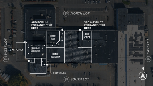 - EXITS: You will also be able to exit through the current lobby space by going through the same way you entered – this exit will be ideal for parents picking their children up from eKids or 3rd & 45th Street. There will also be 3 additional exits available out of the Temporary Auditorium: 2 towards the West Lot parking area and 1 towards the South Lot parking area (see map). If you aren't picking children up, exiting here will be quickest!
